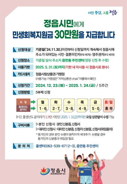 신청 기간은 각 지역마다 다르고, 아직 민생회복지원금 지급이 결정되지 않고 있는 지자체가 많이 있습니다. 예를 들어 아래는 정읍시의 지원금 지급 공고 입니다.